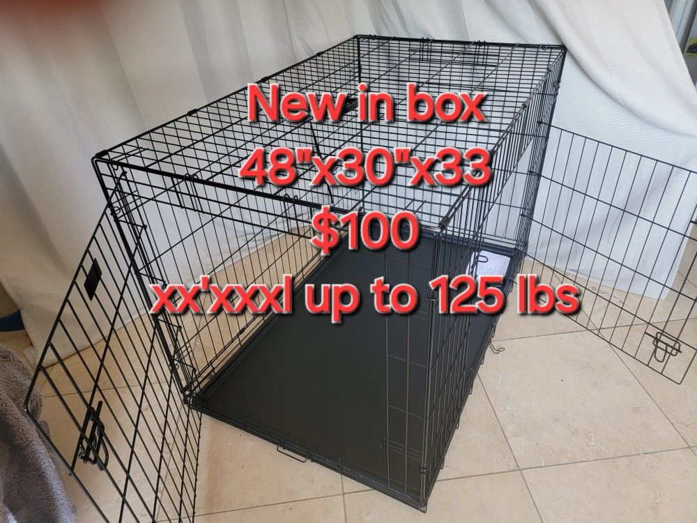 Brand New 48"x30"x33" dog crate cat cage Xxl'xxxl dog kennel up to 125lbs pet carrier 2 door folding dog cage kennel with easy slide out tray and quick & easy pop up assembly NO TOOLS NEEDED. $100 I offer new pet packages. $150 includes 48" crate, 2 heavy duty chew toys, 2 nonslide stainless steel bowls, option of 1 crate blanket or 1 pet bed of choice. 1 heavy duty reflective dog harness available in Sm - Xl. Different colors. 1 dog leash of choice with poo bags All Brand new pet supply on my page. Smaller crate sizes available s well as dog houses, kennels , pet playpens and more. Jaulas de mascota,