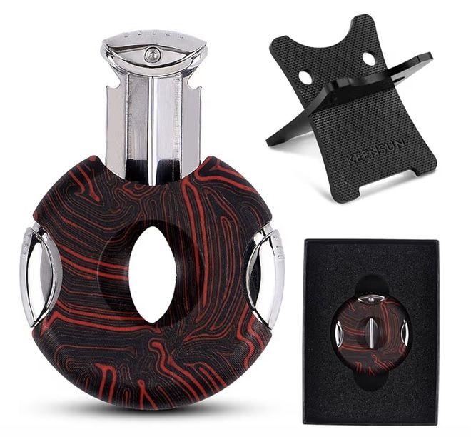 Product details Top highlights Perfect Design: The ring gauge of the cigar cutter is 60,the thickness is 0.47 inches and the weight is 0.16IB.Use G10 (polymer composite material) red and black texture as the shell material of the cigar cutter. Use a spring to assist in opening the blade, press both sides of the cigar cutter with your thumb and index finger to open the blade, and press the popped top to close the blade.Pair it with the G10 cigar holder for the perfect two-piece combination. High Quality: The shell is made of G10 material, which has a high degree of non-slip and corrosion resistance.The blade is made of stainless steel.The blade is sharp, hard and rust-proof.The precisely designed blade angle provides the best cutting depth, cutting cigars easily and smoothly without damaging the cigar cap. Easy to carry:The cigar cutter has a compact shape and is convenient to carry and use.Perfect for business occasions, out-of-home use, home use and other important occasions. Best Idea for Gift: The cigar cutter can be used as an ideal gift for boyfriends, husbands, fathers on anniversaries, Christmas, birthdays, Halloween, Father's Day, Thanksgiving Day, Valentine's Day or other special days. If you are looking for a meaningful and unique gift for someone who likes to smoke cigars, then our cigar cutter must be a perfect choice! Packaging and Service: The cigar cutter is packaged in a gift box with a cigar holder,which not only protects the product, but also considers the appearance of convenience as a gift.
