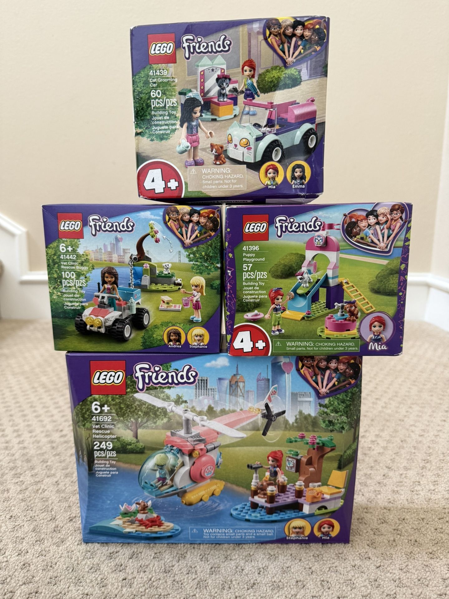 Includes: Lego Friends Vet Clinic Rescue Helicopter 41692 Lego Friends Vet Clinic Rescue Buggy 41442 Lego Friends Puppy Playground 41396 Lego Friends Cat Grooming Car 41439 (box a little smooshed from storage) Lego Friends Emma’s Dalmatian Cube 41663 (x 2) Lego Friends Olivia’s Flamingo Cube 41662 (x2) Brand new, sealed. Pick up in Irvine. Cash only.