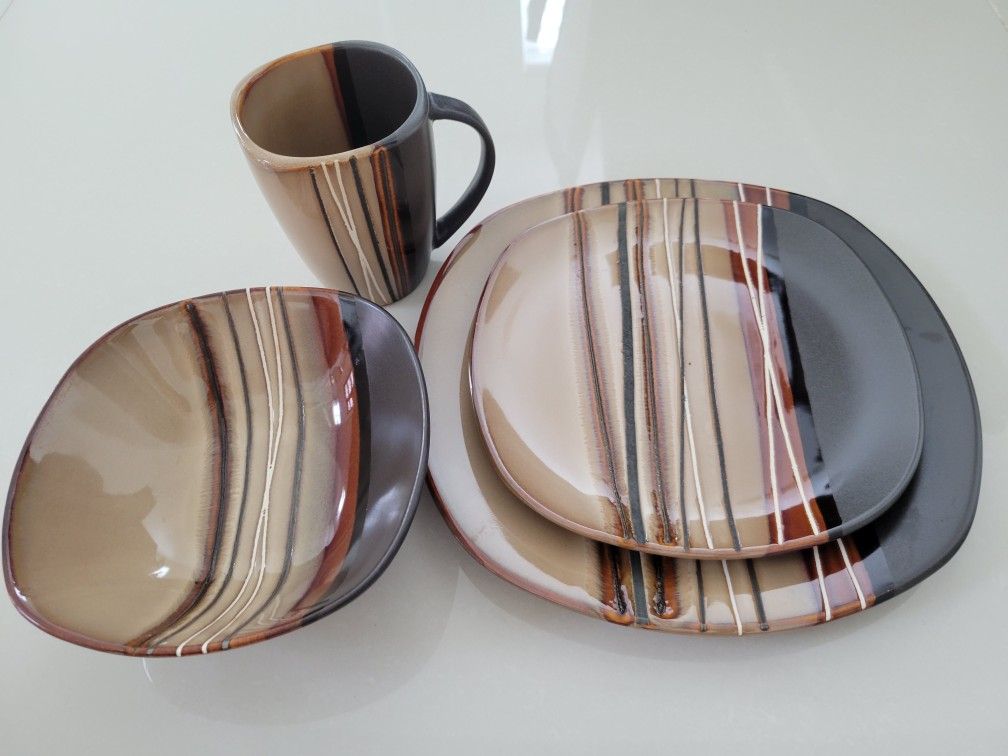 Lightly used, all in excellent condition. 6 bowls 6 small plates 8.5 x 8.5 in 6 large plates 11 x 11 in 7 mugs