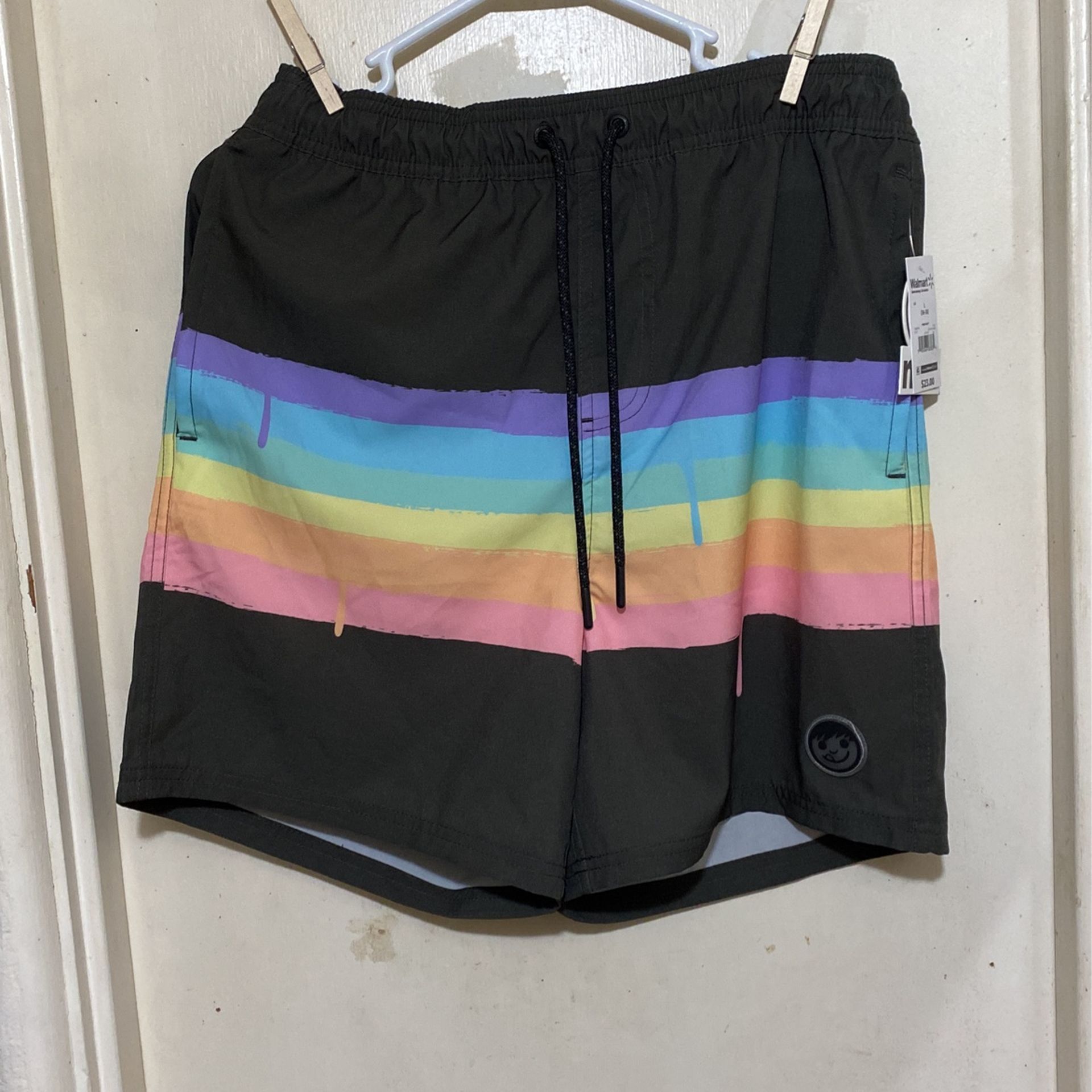 Men’s swim trunks with tags has two front/pockets one zippered back pocket 92% polyester 8% spandex that means it drives real fast brand new not lined