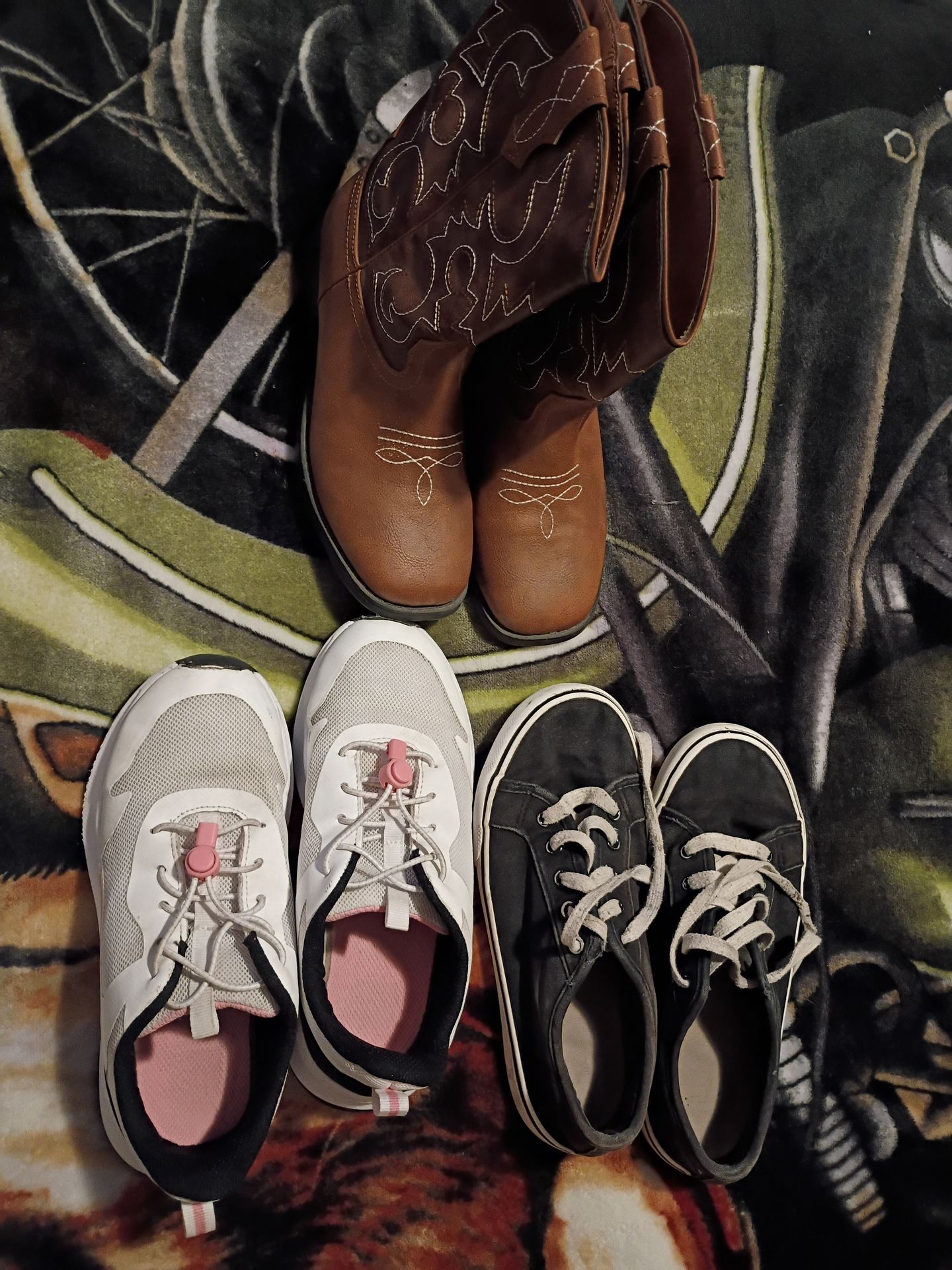Selling these brand new boots size 3 girls for $20 Selling the pink/white shoes size 3 for $15 Selling these black shoes used couple of time for $10