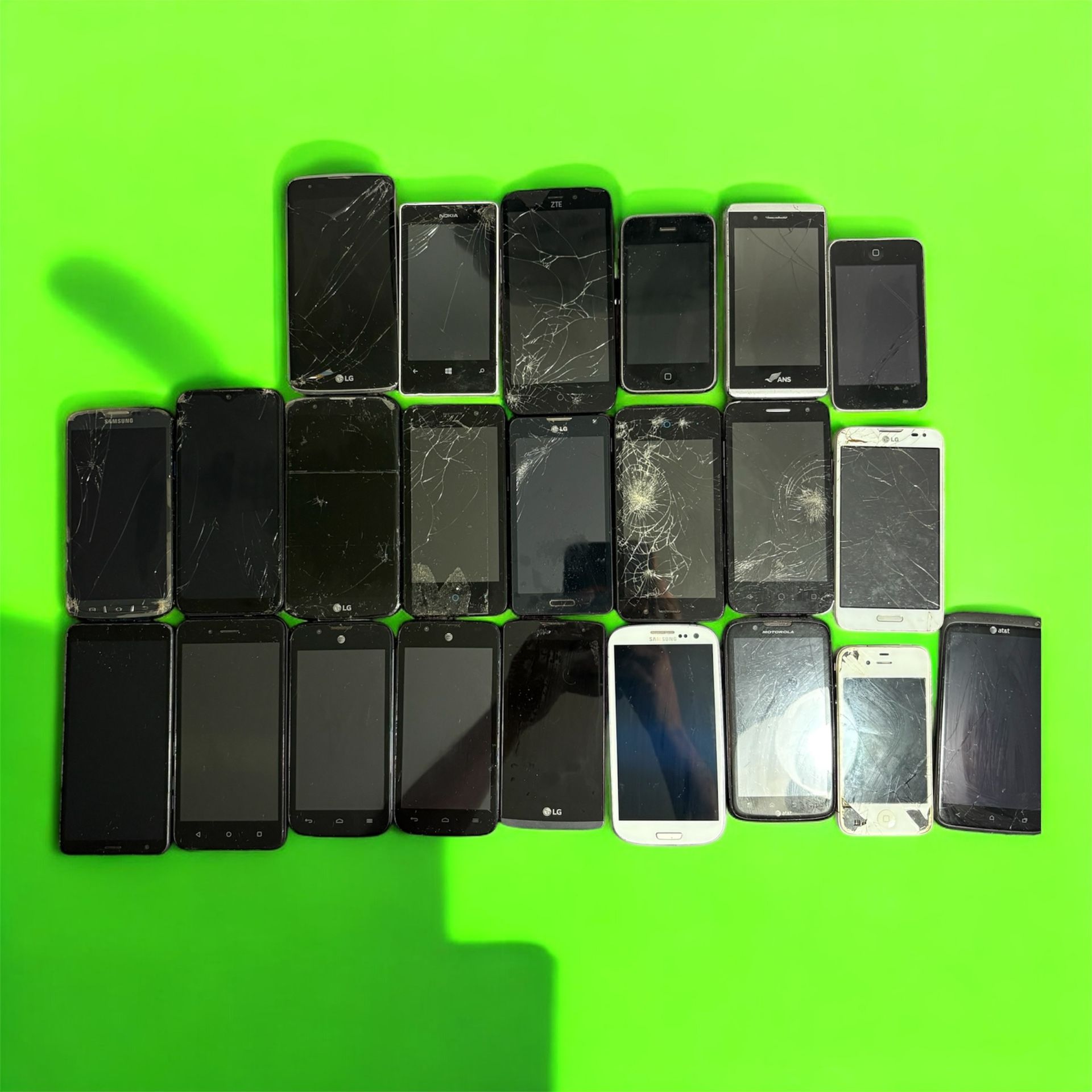 The product is a collection of 23 touchscreen phones from various brands These untested devices are sold for parts or repair, providing opportunities for fixing or refurbishing damaged or broken phones. See pics