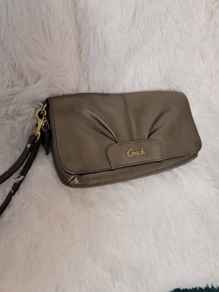Large flap wristlet wallet, bronze steel, black interior. Like New, see photos