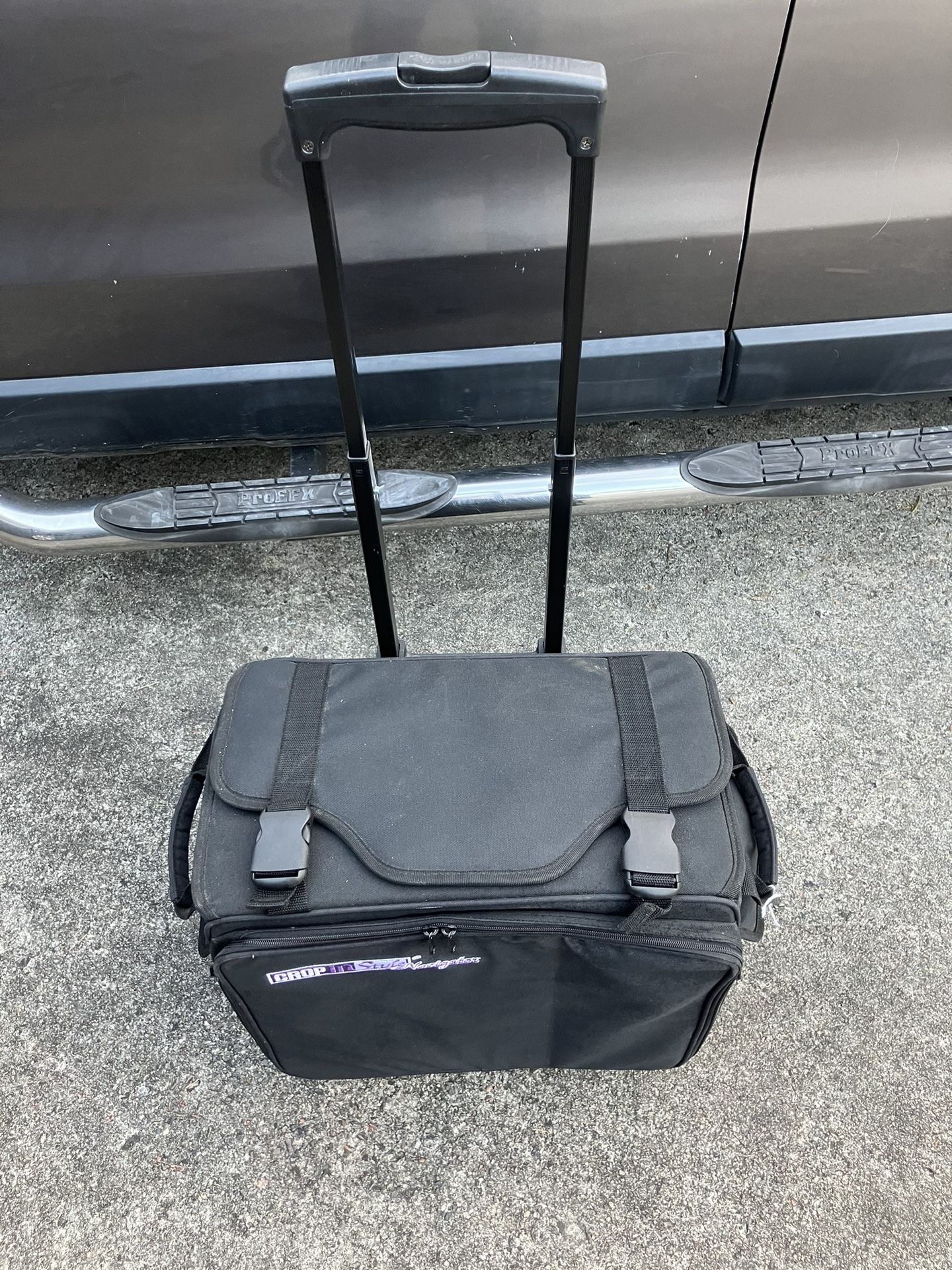 17by 16 in by10 in tote on wheels . Ridged construction outside and inside pockets. Nice