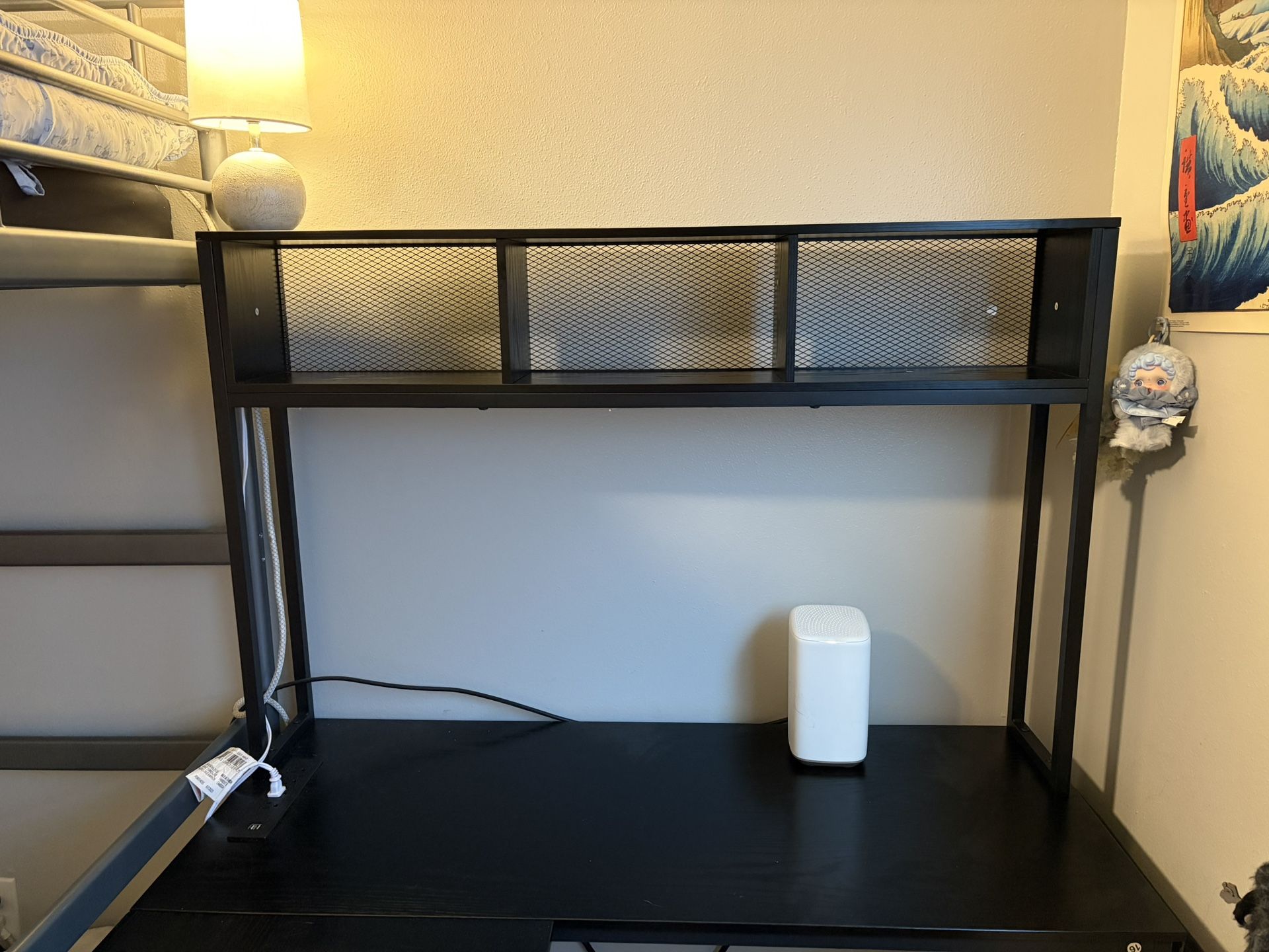 Desk has a small drawer and side compartment. Below the drawer can fit a PC if you are looking for a desk like that.