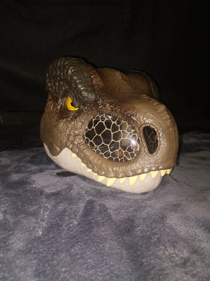 Jurassic World Dominion Tyrannosaurus Rex Chomp N Roar mask Opened no box, but in like new condition Asking $20 obo Jurassic World: Dominion comes home with adventure and thrills as kids become a ferocious dinosaur with this realistic Chomp 'N Roar Tyrannosaurus Rex mask! For ultimate dinosaur roleplay, the mask has 3 levels of jaw-opening fright and increasing roaring sounds. As kids open their mouths, the jaw gets wider and scarier and the ROARS get louder! Kids ages 6 years and older can CHOMP their way through playtime. The eyebrows move, too, for extra ferocious look, along with realistic design, color and texture! An adjustable strap fits the mask securely to any child's head. Eye and nose openings provide visibility for the rampaging dinosaur during role play. Makes a great gift for dinosaur lovers, letting them live the dream of actually becoming a Tyrannosaurus Rex!