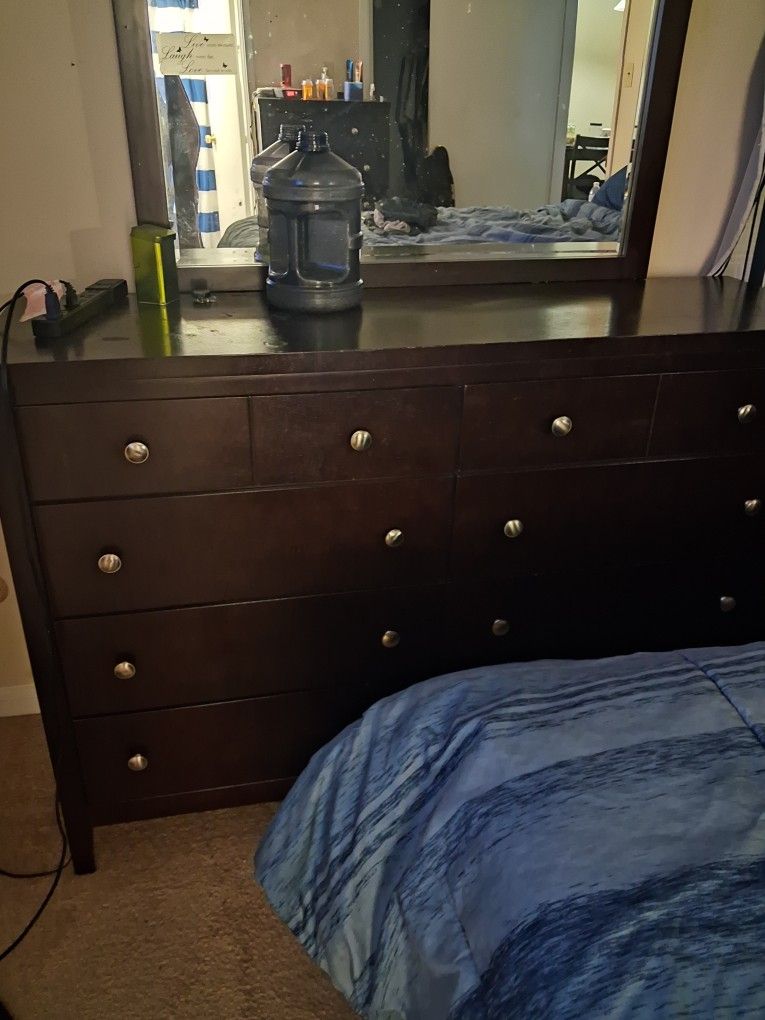 Dresser with mirror, dresser drawers, Queen size bed, dining room table, 2 end bedroom tables
