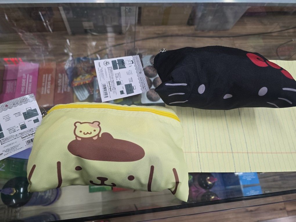 Several Hello Kitty and Pompomurin travel suit case bags. Approximately 20x20 in size. Very durable nylon, portable and easy to wrap up and put away in a small little tote