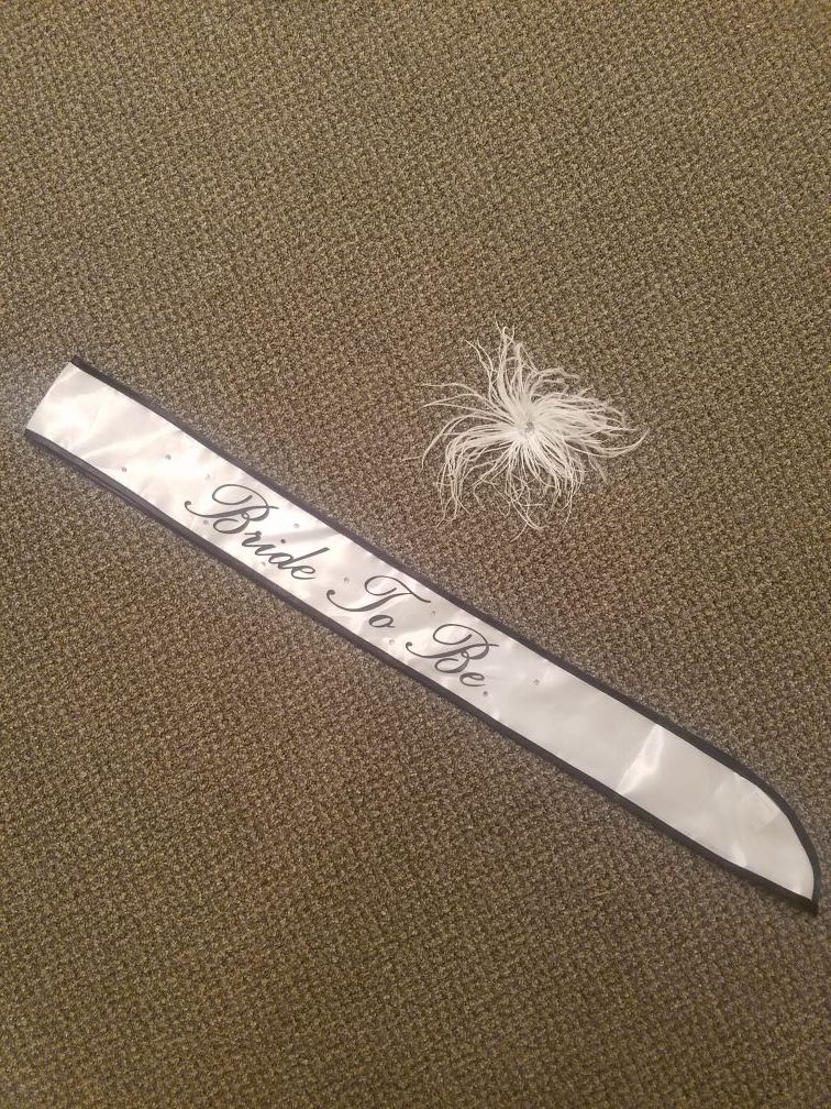 Beautiful white feather with gen in the middle hair pin and bridal sash with gems. Very pretty!