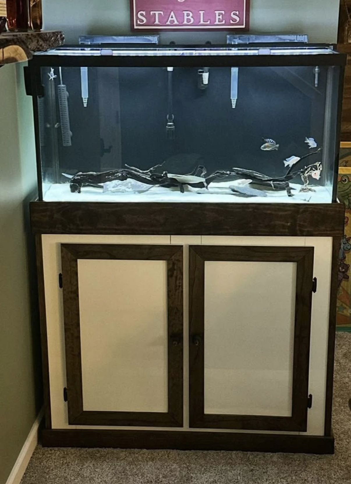 All items being sold together.: 90g Aqueon Aquarium Custom made stand with open back for easy access to outlets Aquasky light bar Two Aquaclear hang on filters One fluval 407 canister filter 2 glass lids Heater All accessories with as well.