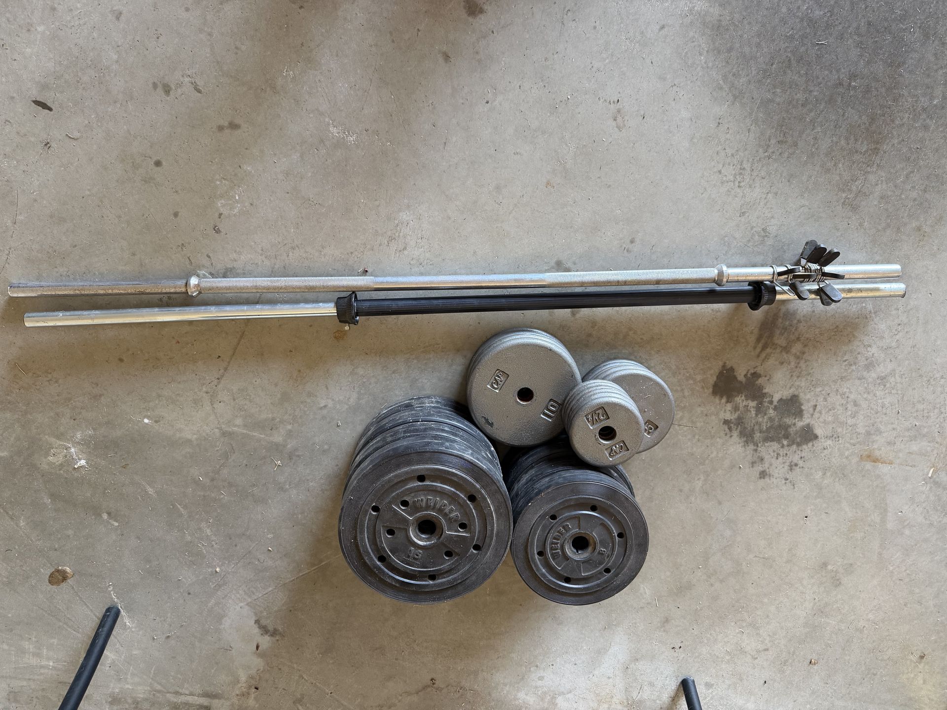 Weight set 4 15 pounds 4 8 pounds 4 10 pounds 4 5 pounds 4 2.5 pounds 2 bars