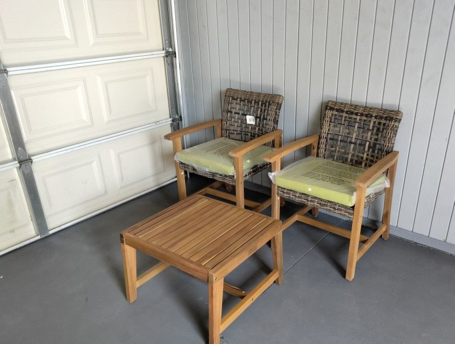 Outdoor patio 3 piece bistro set, 2 wood chairs with coffee table and cushions $170 firm no less