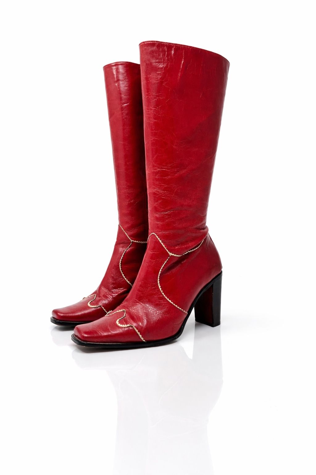 Vintage 1990s Charles David rare color-way vibrant red leather boots feature a heavy white contrast stitching emphasizing the paneling of the boot. Made in Italy from genuine leather. Women’s Size 39. Very good condition.