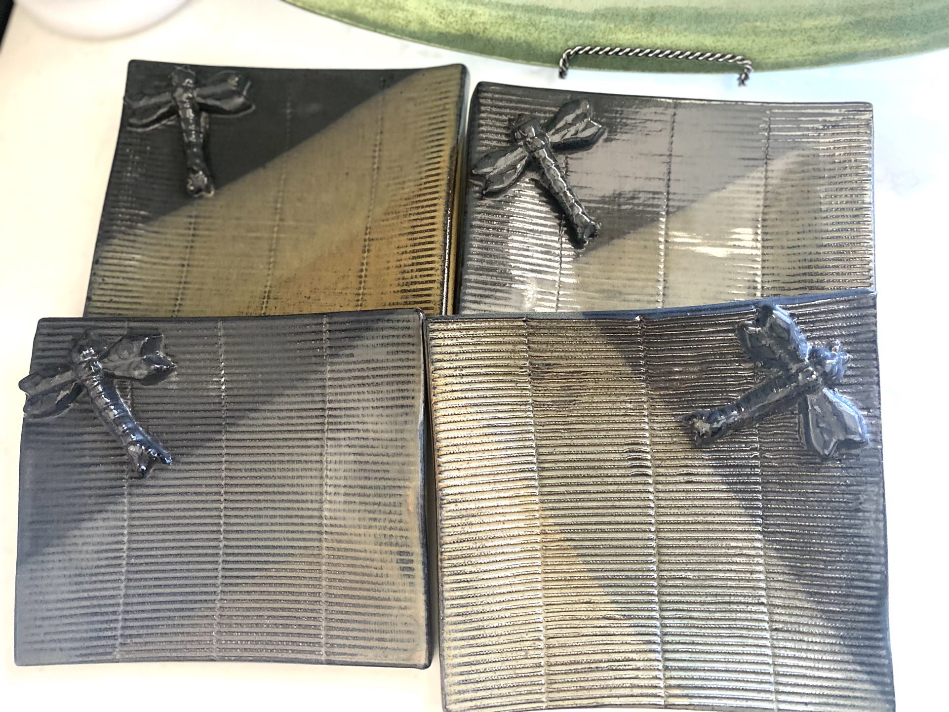 Artist Signed Pottery Dragonfly Sushi Plates / Appetizer Plates- set of 4 (all slightly different) Hand thrown - all slightly different in color… Slightly different in size … and dragonflies are all slightly different as well