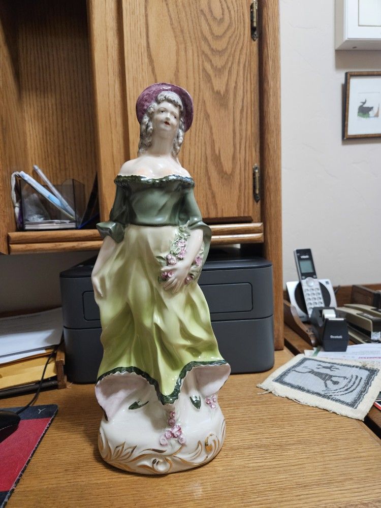 I am selling a vintage porcelain figurine of a Victorian lady from the maker Cordey China Company, based in Philadelphia. Company was known for producing hand-decorated figurines and ornamental vases that were often inspired by European designs. These pieces were individually crafted and hand-painted, making them unique collectibles. Item is in mint condition as I see no chip or dings. Item is marked with "Cordey #302 JM" on the bottom and likely produced in the 1940s. Item measures 16" tall X 5.5" wide by 4" wide where it sits.
