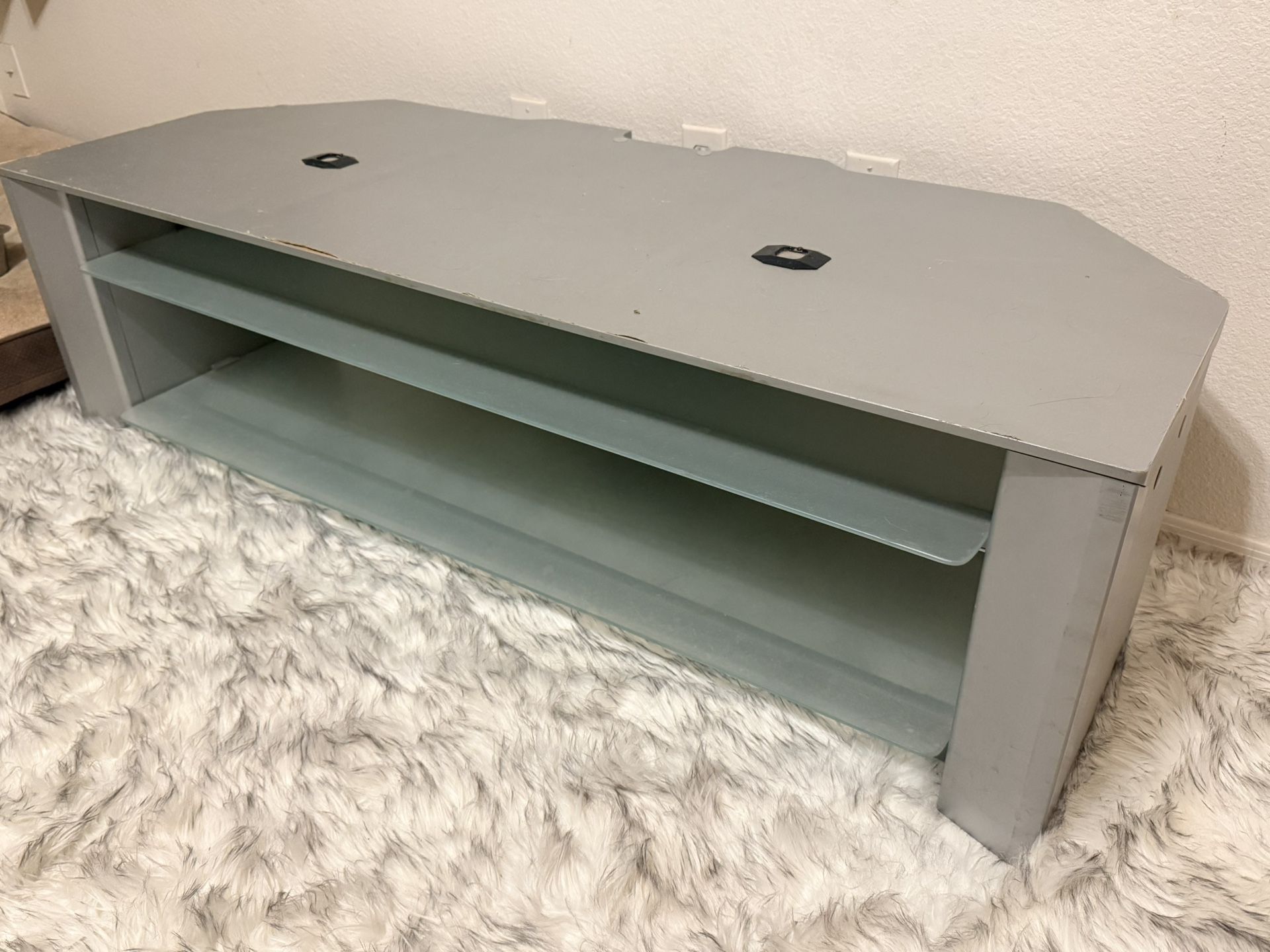 Grey Wood TV Stand w/Glass Shelves Size (LxWxH): 22” x 54” x 16” I had a 75” tv on this stand, but make sure to measure the length of the bottom legs of the tv to make sure yours will fit. Stand is very heavy and has two nice glass shelves under the top. The top does have a few places where the cover is starting to wear on the ends (refer to the pictures) Located for pickup around 67th ave and Bell Rd