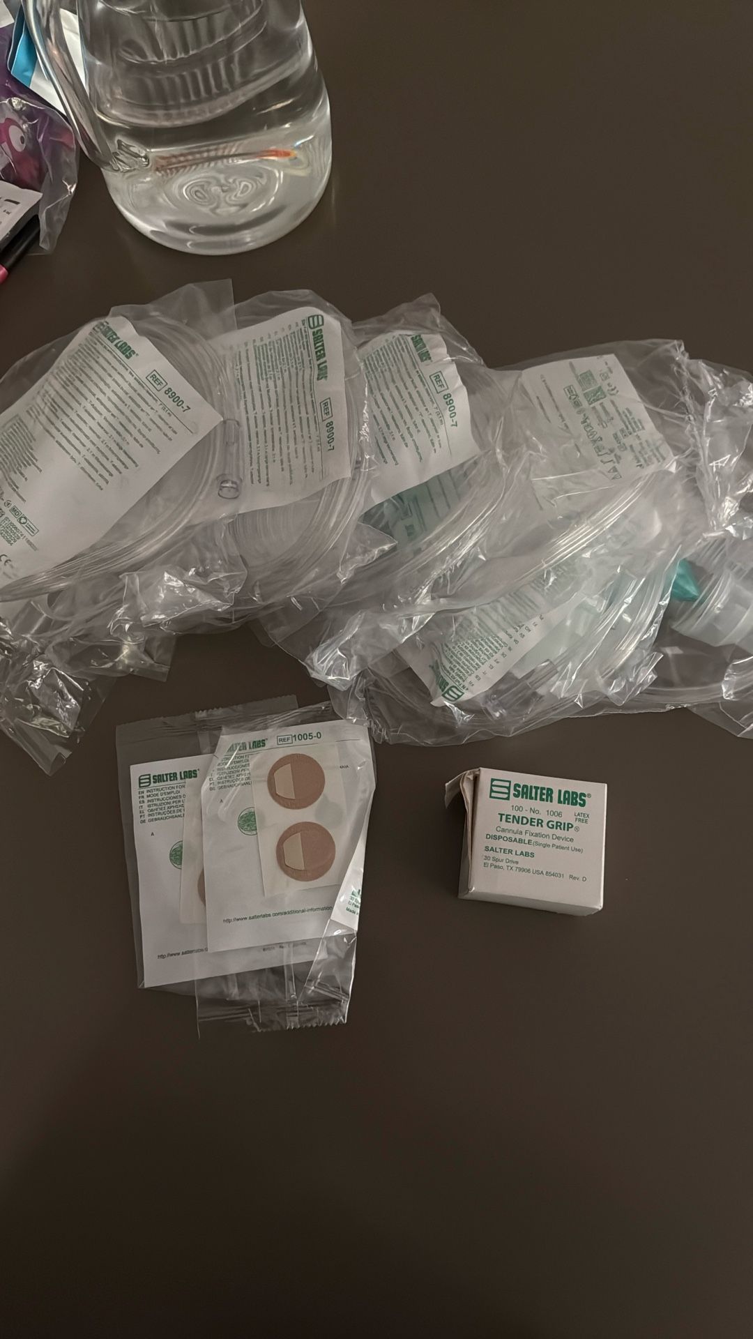 6 unopened full kit nebulizer sets 2 unopened tender grips 1 opened and used tender grips roll My daughter doesn’t need oxygen therapy anymore. I want to give these for free to someone who is getting oxygen therapy.