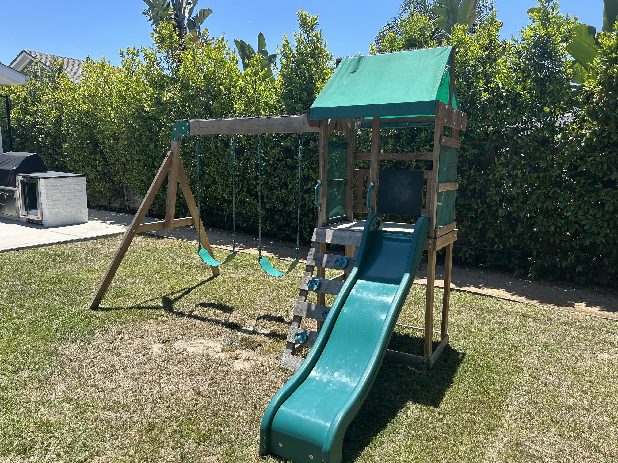 Children’s swing set and slide play house - purchased in 2022 for $500. Selling for $50. Pick up only. Dimensions: 107”D x 123” W x 92” H Designed For The Littles: Ideal Starter Swing Set And The Most Fun For Ages 3-6 Years Old Upper Play Deck: Covered Upper Deck To Stay Protected From Uv Rays Covered Yet Visible: Mesh Panels On The Upper Fort Provide Protection And Still Allows Visibility For Parents Climbing Fun: Rock Wall Ladder Combo For A Challenging Climb Or An Easy Step Up. Swinging Fun: 2 Belt Swings With Rope Chains, Gentle On Little Hands And No Pinched Fingers Sliding Fun: 6 Foot Super Speedy Slide Naturally Resistant To Rot & Decay: 100% Cedar Wood Sturdy: Reinforced Steel Support Brackets Ready To Assemble: Pre-Drilled, Pre-Stained And Pre-Cut Materials For Assembly Security Accessories: 15" X 15" Chalk Board, Large Enough For Multiple Masterpieces