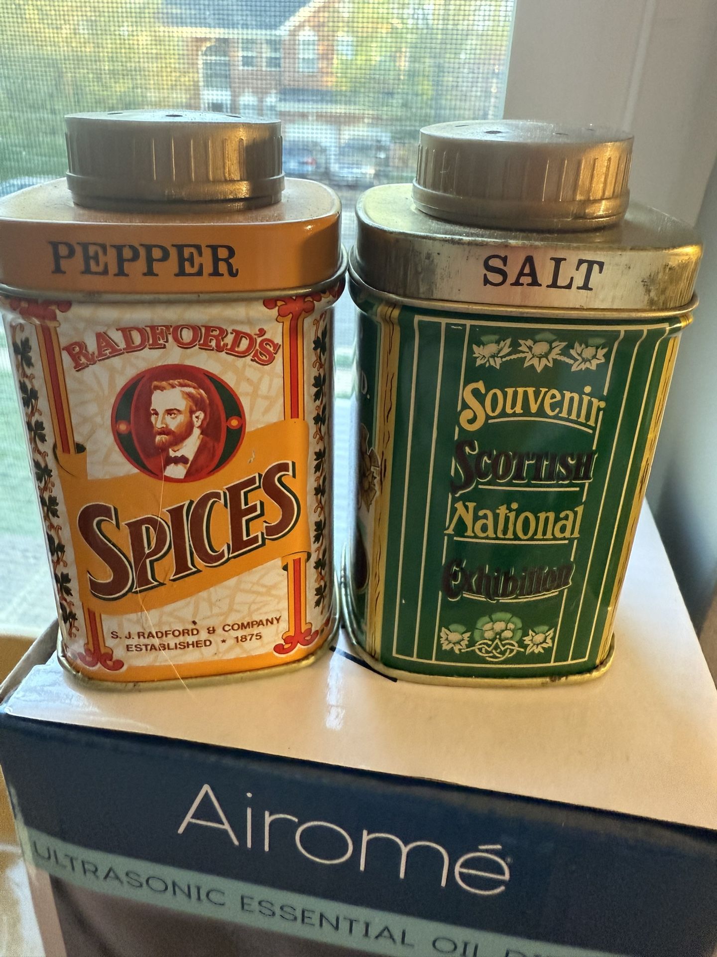 SALT AND PEPPER TIN STYLE so cute to have in a country style decor. no isssues for either about 3-3 1/2 inches tall 15.00 cash pick up Leesburg ALSO HAVE OTHER SALT AND PEPPER DECOR