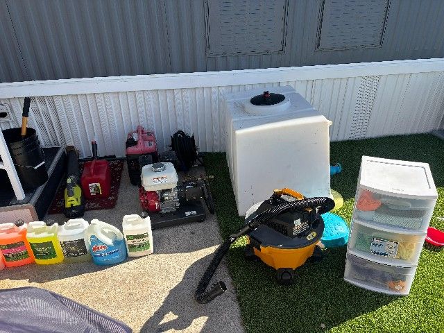 Complete car wash equipment for sale: liquids, rags, tank, generator, pressure gun, vacuum cleaner, and more. If anyone is interested, please feel free to ask.