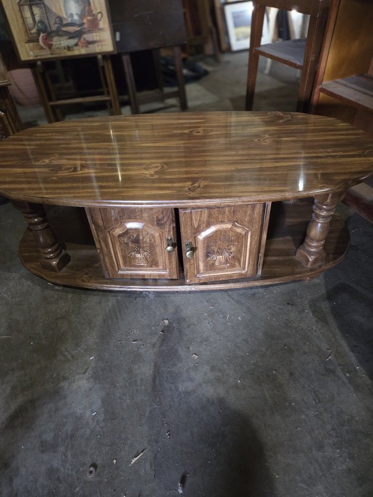 This appears to be a vintage or traditional style oval wooden coffee table featuring a glossy finish and two central cabinets with carved doors for storage. It sits on a lower base shelf supported by four chunky, turned legs. Key Features Design Style: The turned legs and carved door details suggest a traditional, vintage, or possibly French Country aesthetic. Shape & Structure: It has an oval top and a lower, matching oval shelf that provides stability and a display area. Storage: The central cabinet section offers enclosed storage, which is useful for tucking away living room items like remotes or magazines. Material: The construction is likely a mix of solid wood and engineered wood with a veneer finish, common for durability in this style of furniture.