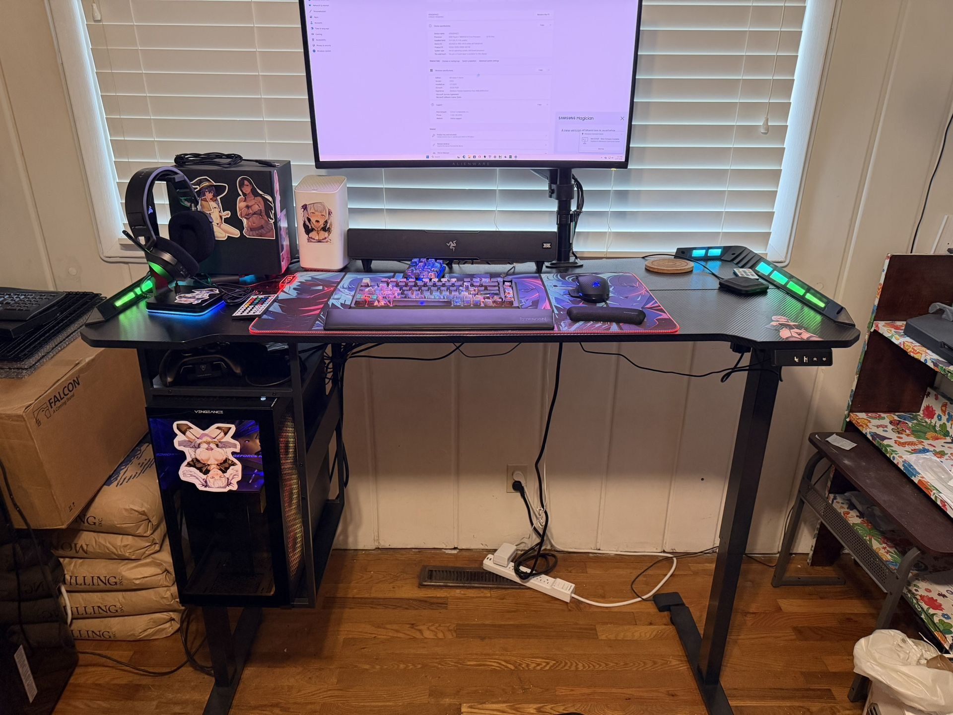 $2800 for pc only (no monitor) Motherboard is x670E gaming plus wifi (ms-7E16) 2 - 2tb NVMe had drives (Samsung 990 pro and Corsair mp600 core xt) Corsair hs80 max wireless headphones with microphone and rbg recharging stand Alienware AW3225QF rbg 32” curved 4k monitor with desk mount 32gb ram 6000 mt/s AMD Ryzen 7 9800X3D 8 core 16 thread processor Nvidia GeForce RTX 4080 Super graphics card 6 fans and liquid cooling Corsair RM 850e power supply Corsair dark core rbg pro se wireless mouse Turtle beach stealth ultra controller and docking station Red dragon - Pneumbra pro RBG wireless keyboard with cyberpunk edgerunners key layout and some REAL crystal keys (quartz, amethyst, lapis azule) Large Cyberpunk edgerunners light rbg mat. Carbon fiber adjustable standing desk. Gaming chair with added lumbar cushion and arm rest cushions, adjustable arm rests in 2 directions and extendable leg support Will add speakers upon request for an extra $150. Razer leviathan V2 with subwoofer and special sound. Sounds really good honestly, which is why it’s extra, I might like to keep it for playing movies on my laptop. No lowballs, serious inquires only. I’ve had for at most 2 years. No longer gaming so that’s why I’m selling. I will entertain including VR setup. (See my other post) I will remove any stickers prior to sale