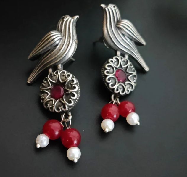 Beautiful Birds With Red Stone Brass Earrings Red White Pearls