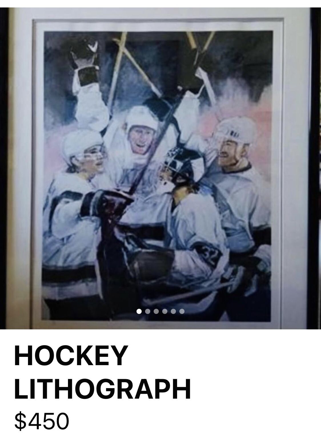 Entitled “ Celebration” by well-known artist Stephen Holland. Limited Edition 134/500. This beautiful piece depicts the game when Wayne Gretzky took the L.A. Kings to the Playoffs in his first year as a King. This is an absolute beautiful piece. Very heavy. Measures height 40” width 34” Very Heavy