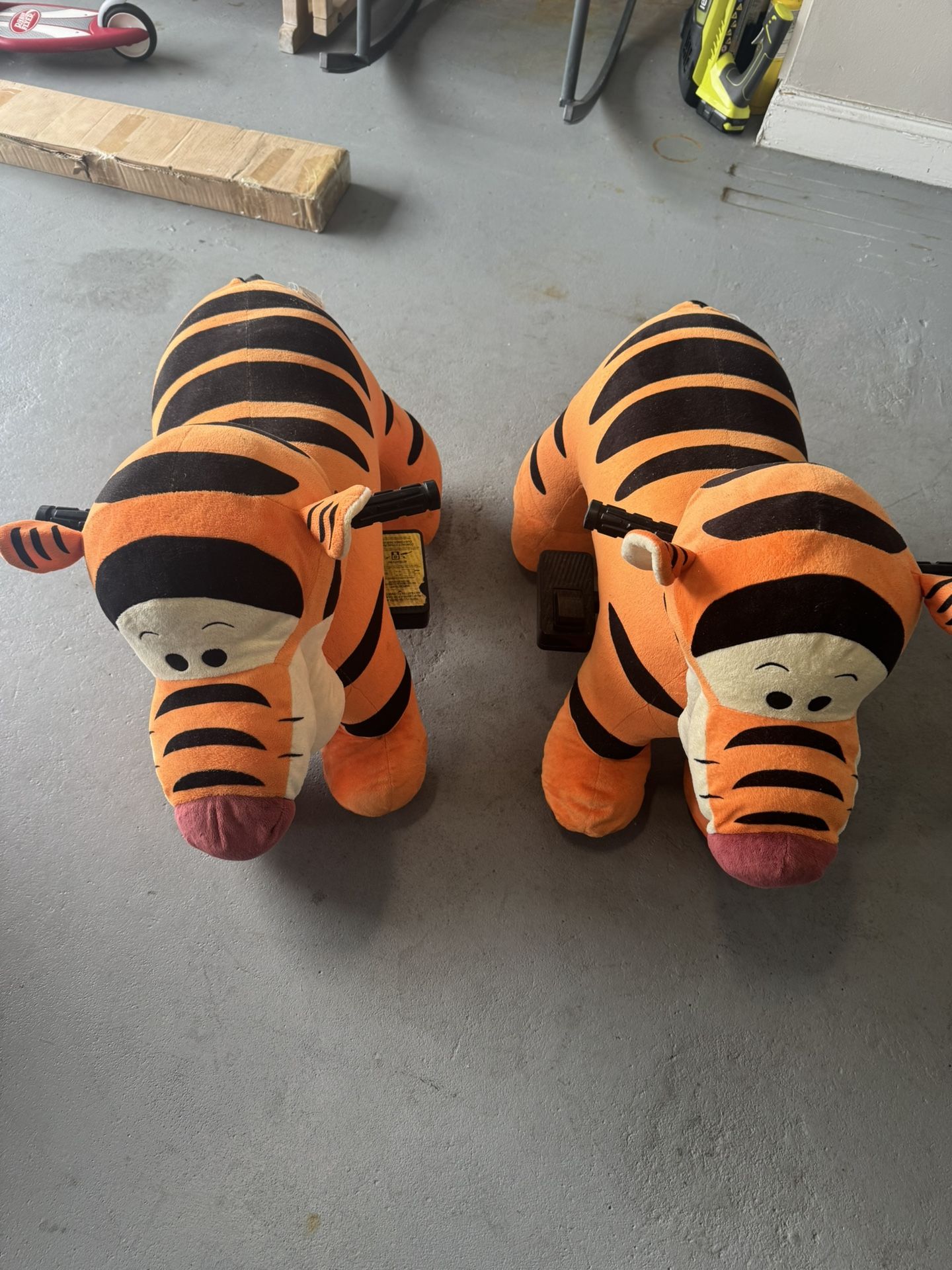 2 for 150.00 or 1 for 75.00 Tigger 6V Plush Ride-On is ready to spring, or roll into adventure! Tigger is ready to reach a maximum speed of 2.5 MPH as he heads off for adventures with Pooh and Christopher Robin! With his distinctive orange and black stripes, large eyes, long chin, and tail, our adorable Tigger 6V Ride-On is ready to become your child’s new best friend!