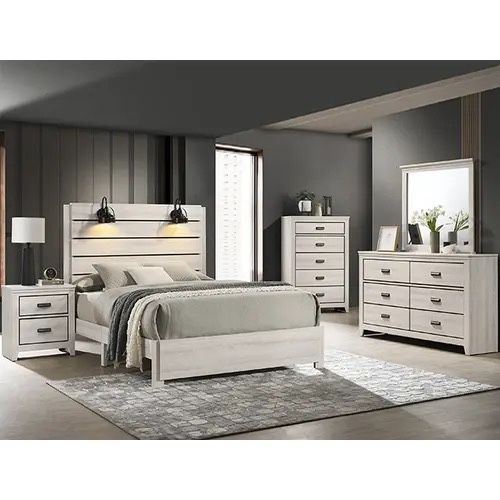 WHITE FINISH LIGHTING DECK NEW IN BOX ASSEMBLY REQUIRED MATTRESS NOT INCLUDED FULL SIZE BED: 79 X 56 X 58"H - $1299 QUEEN SIZE BED: 84 X 62 X 58"H - $1399 EASTERN KING SIZE BED: 84 X 78 X 58"H - $1499 INCLUDED: ONE (1) BED ONE (1) NIGHT STAND ONE (1) MIRROR ONE (1) DRESSER