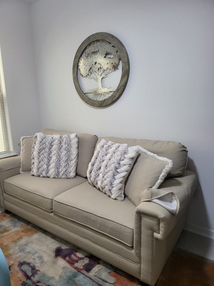 Beige sofa 87" wide. Great condition, like new no pets clean. Pillows included. Nail studs on arm caps also included.