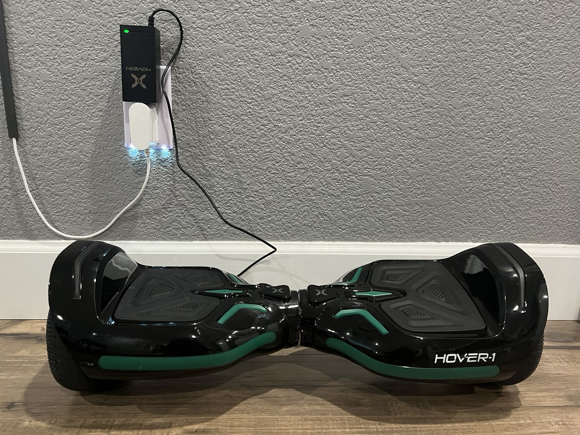 Black with green Hover-1 hoverboard, comes with original charger, nylon carrying case and go-cart attachment. It has some issues holding a charge, so might need a battery replacement. It’s always been stored indoors.