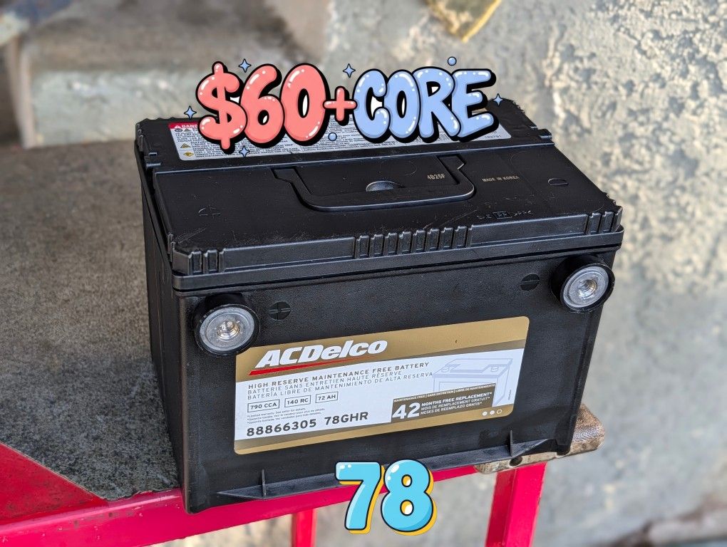 Car Battery Group Size 78 2024 In excellent condition. Fully Tested. $60 with core exchange (old battery) or $70 without. You're welcome to bring your own tester, but I'll also provide one. Payment accepted via Cash or Zelle. Located in Boyle Heights.
