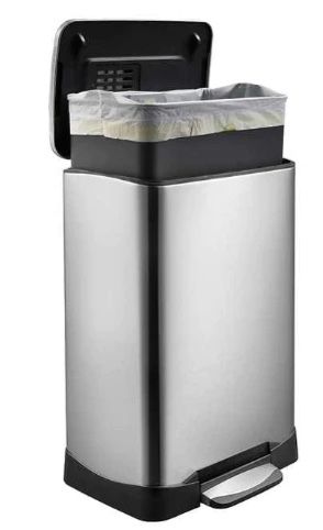 USED NO BOX 1 open box with dents FEATURES: Fingerprint-resistant Brushed Stainless Steel Durable Cantilever Foot Pedal Mechanism Built-In Deodorizer Compartment Patented Easy Lock Stay-Open Lid Dimensions 19.9" x 13.7" x 25.6"