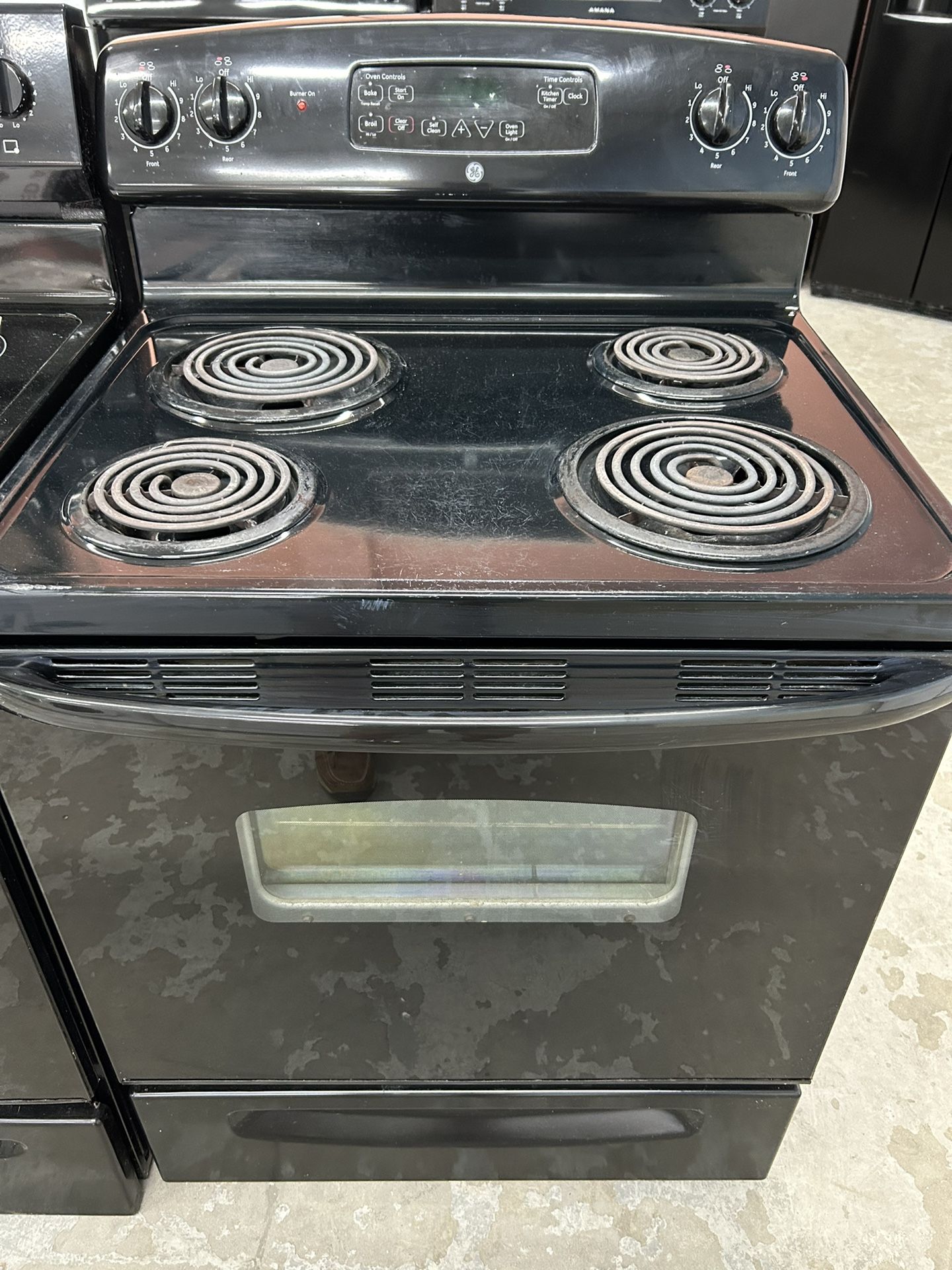 GE self clean black coil top stove for sale. Top has 2 large burners and 2 small burners. Easy to use digital clock with one touch self clean and custom broil. Large oven with light and window in the door. Comes with warranty. Financing and delivery available. Questions please call three two one (contact info removed).