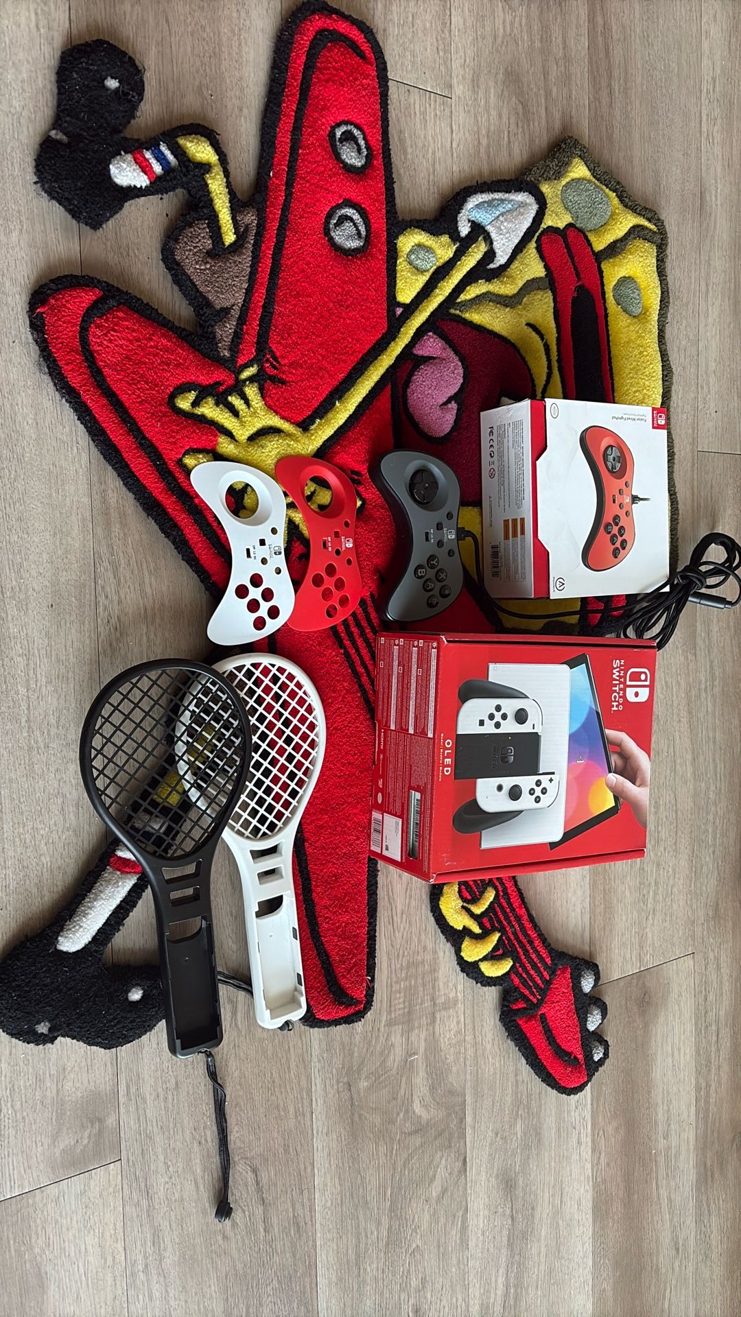 Item comes with The Nintendo Switch OLED console, addition Nintendo Switch wired controller that has different color skins, Pair of Nintendo Tennis Rackets all clean and new(great) condition I’m asking for 300$