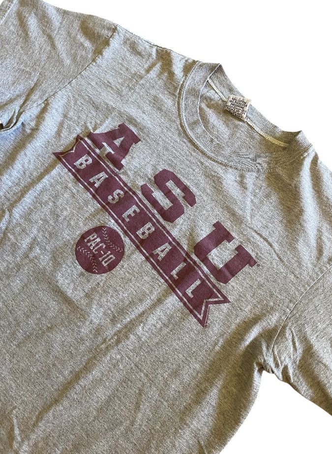 Gray vintage short-sleeve tee featuring maroon ASU Baseball graphic. Comfortable, breathable cotton blend for everyday wear. Clean collegiate print ideal for fans and casual outfits. Campus Design Tag Size Large Vintage Made In U.S.A ASU