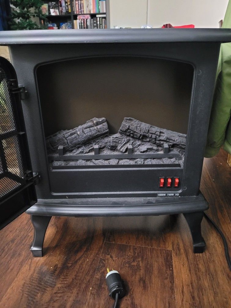 Decorative 750 Watt heater. It was originally a 1500 watt heater, but the switch for the 1500 watt setting failed, but the 750 Watt setting still works. Doesn't light up anymore, the bulbs burnt out. Upgraded heavy duty cord.