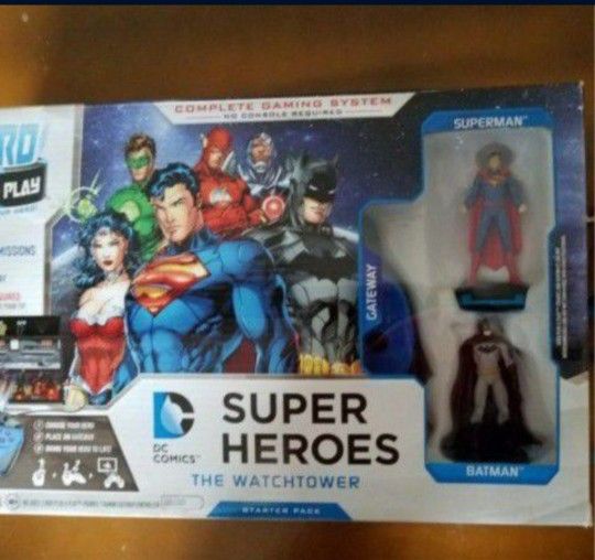 DC Comics Super Heros!!! This system plugs right into tv and has extra characters you can change as you play. Bought for grandkids but they never came to play. Plugged in seen that it works then put away. Only asking $30 for it all. pick up only
