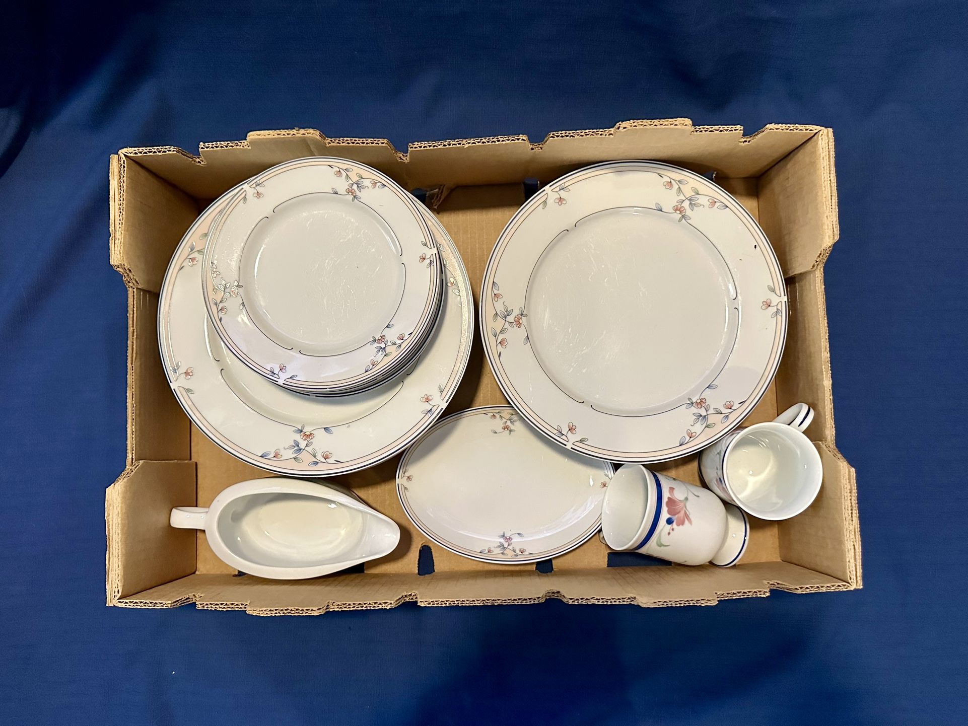 The set includes: 14 plates, 5 salad plates, gravy boat, relish tray and 2 footed mugs.