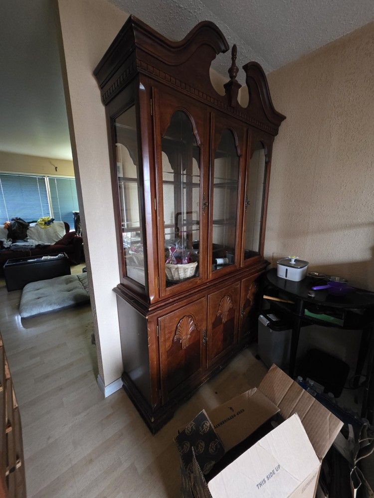Its a dark wood China hutch that comes as a separate pieces, it had a small drawer in the cabinets on the bottom having one shelf on the bottom display and it has glass shelves and glass panes and had a big separate mirror on the back. Its in good condition and the lights work just fine too. And the one of the glass is missing. Pick up ONLY