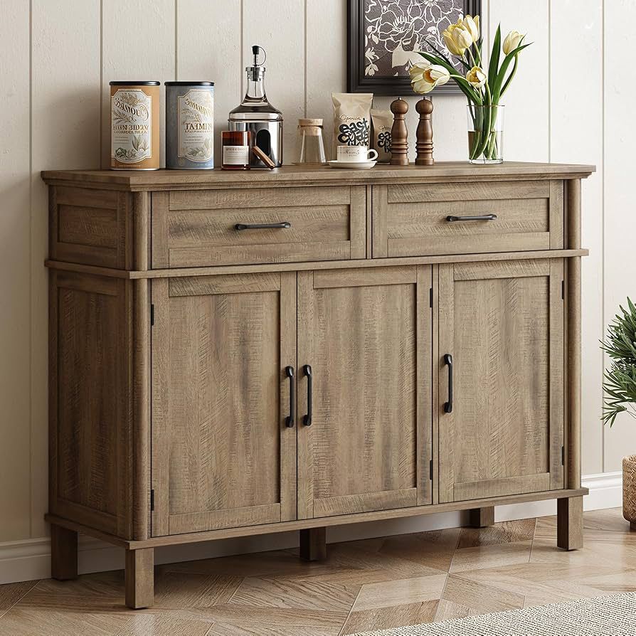 48 Inches Buffet Cabinet with Storage, Farmhouse Sideboard Buffet w/2 Drawers and 3 Doors, Wood Coffee Bar Cabinet with Adjustable Shelves, Sideboard