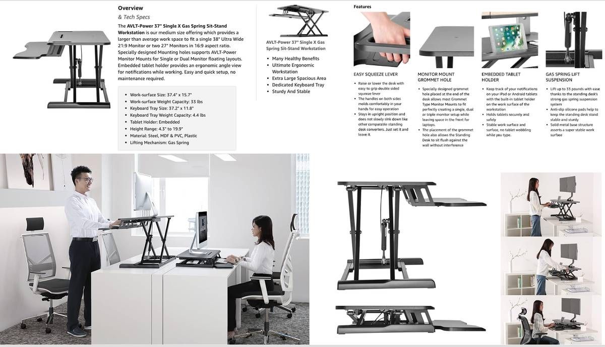 37" Classic Standing Desk Converter - Height Adjustable Sit Stand Desk – Fits Ultrawide 38" Monitor - Large Tabletop with Tablet Holder and Removable Keyboard Tray - Black • AVLT-POWER RISER SOLUTIONS: This sit to stand desk is your affordable and ergonomic solution to help create a unique workspace. Place the Desk Converter onto your current desk to allow you to sit or stand on demand. • FLUID QUICK TRANSITION: Go from sitting to standing in seconds by using the innovate simple squeeze and locking mechanism. Raise the platform straight up and lower straight down within it's own foot print and without additional space needed. Raises from 4.3" to 19.9". • SUPER SPACE EFFICIENT: The top surface measures 37.4" x 15.7", which maximizes space while still providing room for a large 38" Ultrawide monitor or adjustable monitor mount. The 37.2" x 11.8" lower deck holds full size keyboard and mouse side by side. Customize your work area and create the workflow you need. Features: • EASY SQUEEZE LEVER Raise or lower the desk with easy to grip double sided squeeze lever The handles on both sides molds comfortably in your hands for easy operation Stays in upright position and does not slowly sink down like other comparable standing desk converters. Just set it and leave it. • MONITOR MOUNT GROMMET HOLE Specially designed grommet hole placed at the end of the desk allows most Grommet Type Monitor Mounts to fit perfectly creating a single, dual or triple monitor setup while leaving space in the front for laptops. The placement of the grommet hole also allows the Standing Desk to sit flush against the wall without interference • EMBEDDED TABLET HOLDER Keep track of your notifications on your iPad or Android tablets with the built-in tablet holder on the work surface of the workstation Holds tablets securely and safely Stable work surface and surface, no tablet wobbling while you type. • GAS SPRING LIFT SUSPENSION Lift up to 33 pounds with ease thanks to the standing desk's strong gas spring suspension system Anti-slip silicone pads help to keep the standing desk stand stable and sturdy Solid metal base structure asserts a super stable work surface Pick Up only. Elevator building. Carefully maintained in a smoke-free & pet-free home. Payment: Cash, Venmo, or Zelle.