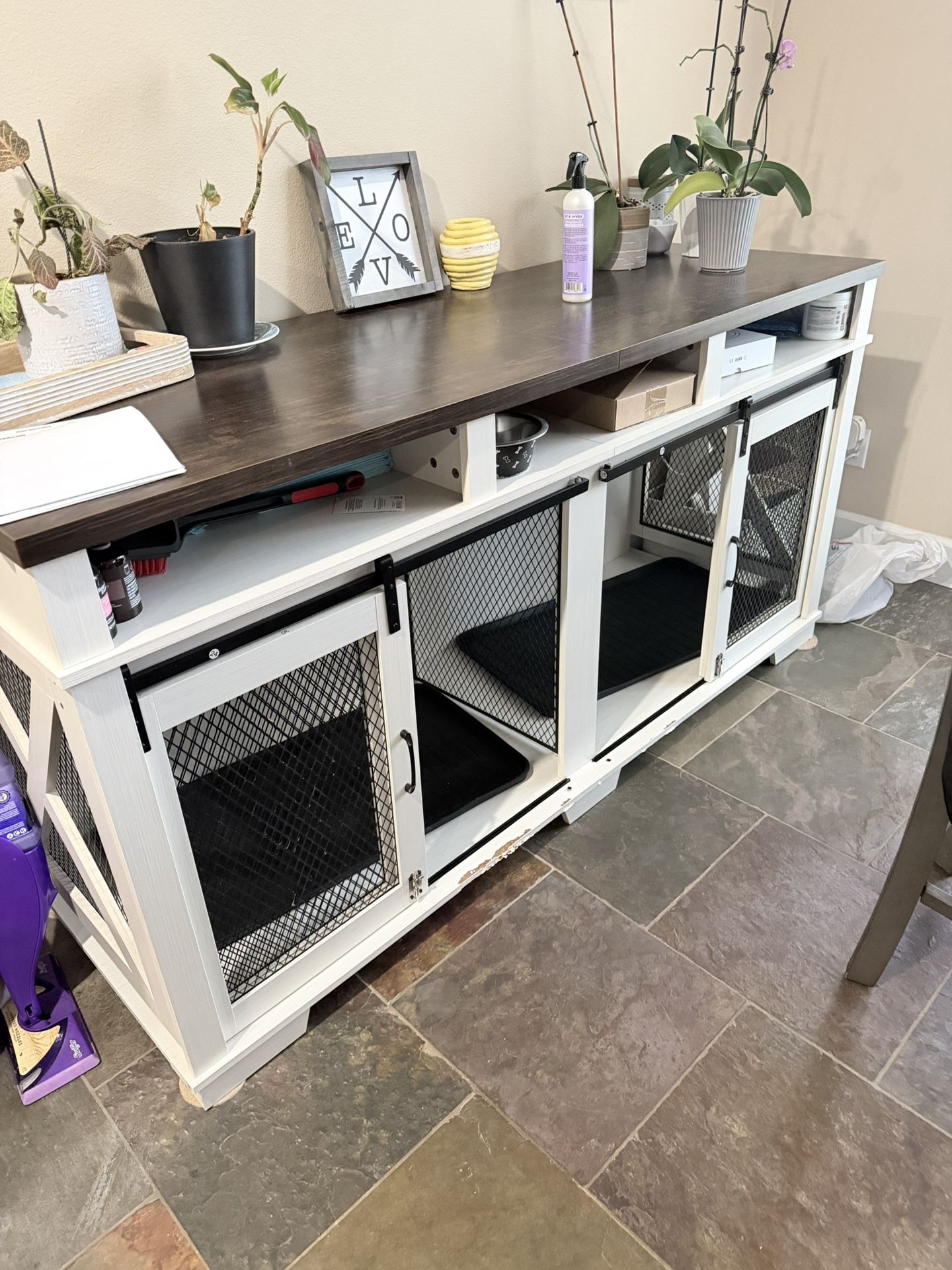 Double dog crate we utilize to kennel our two frenchies. Spacious for small to medium dogs. Please see pics carefully. Small biting damage on lip of board, can be easily sanded and painted. The rest of the kennel is in great shape. Opening on ends to slide dog mat in and out. Doors open and close freely with little locking lever and both doors. Pick up in Tumwater. Can help you load. I have a dolly to utilize. Kennel is very heavy.