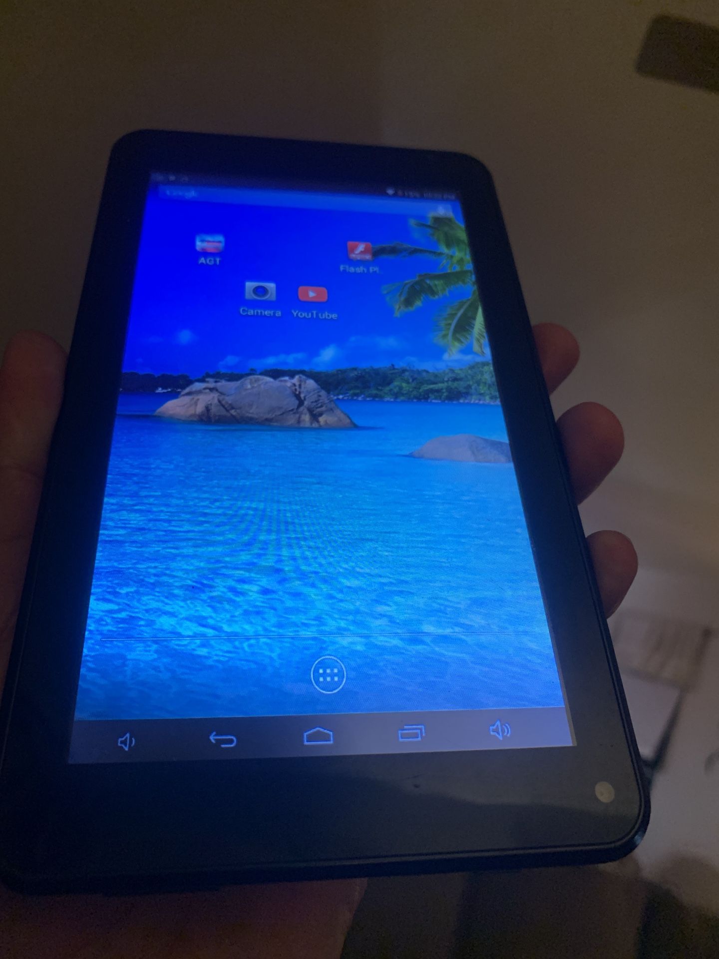 7” generic brand too old to run newer software but if you want to play videos and play old games this will work