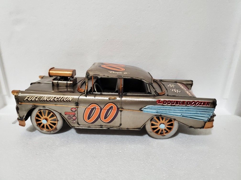 This is a handcrafted vintage-style metal model car modeled after a classic Chevrolet race car. It features detailed paintwork with “Fuel Injection” and “Double Doozer” graphics, bold #00 racing number, and a raised hood scoop — capturing the aggressive styling of retro Chevy hot rods and drag racers. Make/Style: Chevrolet-inspired race car Material: Metal Color/Finish: Metallic silver with copper accents & racing decals Design: Classic hot rod with hood scoop, detailed wheels, and side sponsor graphics WATCH video of exact condition of the item!!!