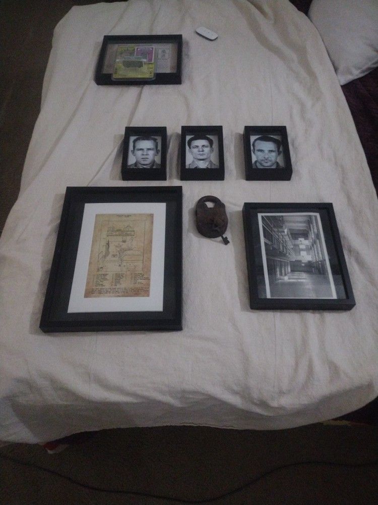Alcatraz collector items ,including 5 framed pics of escapees ,one of the main cell block , and one of a cell regulations for inmates that looks original, it's a detailed description of what is allowed in each cell , and 1 very early padlock with ALCATRAZ SAN FRANCISCO 584 stamped on it , I don't know if this is an actual item from the prison or not , w/keys LOCK : $60 3 INMATE PICTURES $60 ALL CELL BLOCK PICTURE : $30 REGULATIONS FOR INMATES: $100