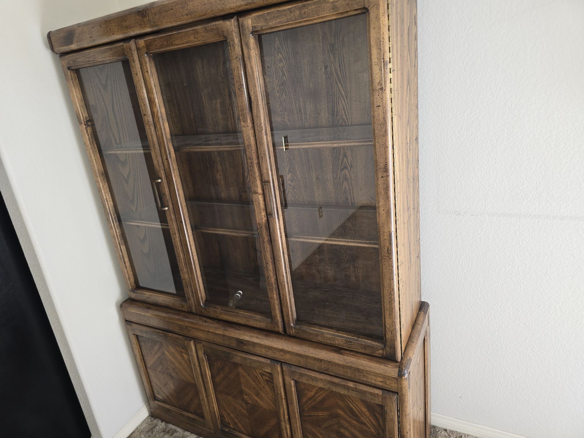 Classic wooden china cabinet. Glass doors on top, shelves inside. Bottom part has solid wood doors and a couple drawers for storage. Great for dining room or living room. Nice wood grain.
