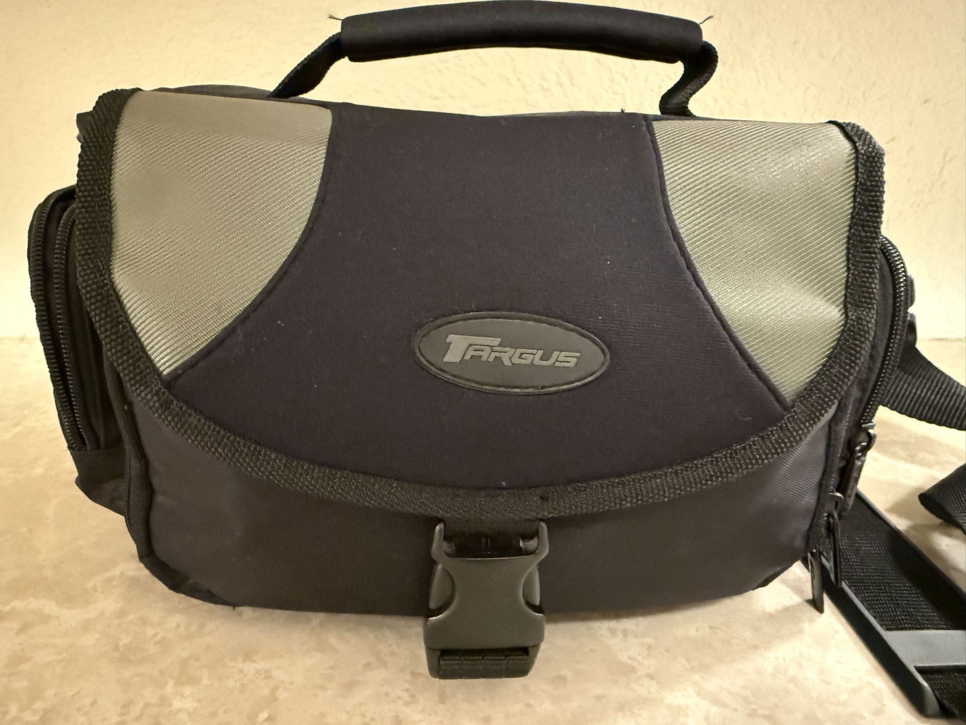 Targus medium size padded bag with four zipper compartment and adjustable, removable padded shoulder strap. Great for carting cameras, recorders, or other electronic devices. Length 11 inc, height 7 in, width 5 in. Regular strap 42 in. Adjustable strap 56 in.